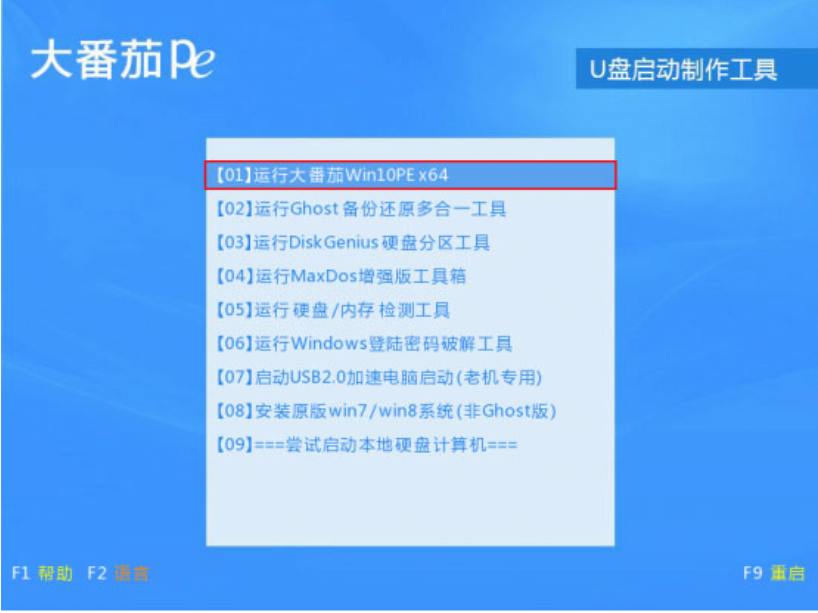 将准备好的大番茄U盘插到电脑USB接口上,重启电脑,在开机画面出来时,通过U盘启动快捷键进入大番茄主菜单界面。