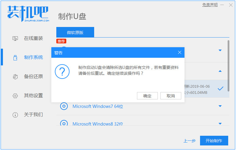 1、安装装机吧一键重装系统软件来制作u盘启动盘。打开工具后,插入一个8g以上的空白u盘进电脑,选择u盘重装系统模式,点击开始制作。