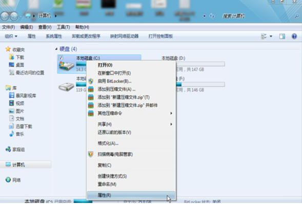 1、打开“计算机”,鼠标右键点击“C盘”,进入“属性”界面;