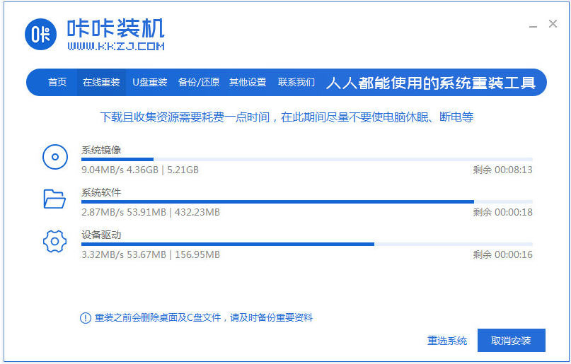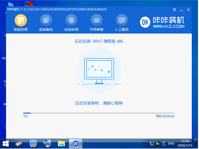 5、咔咔装机工具会自动打开安装win7系统。
