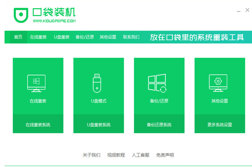 1、上网下载安装口袋装机软件,点击在线重装系统。