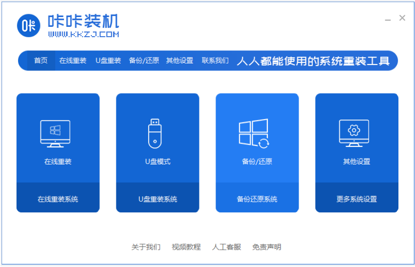1、先把官网上的win7旗舰版64位镜像下载好,解压到非c盘,然后在浏览器上下载好咔咔装机一键重装系统软件并打开,点击备份还原系统。