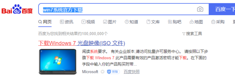 1、直接搜索输入“win7系统官方下载”,即可找到微软官方地址,选择url为Microsoft的网址进入。
