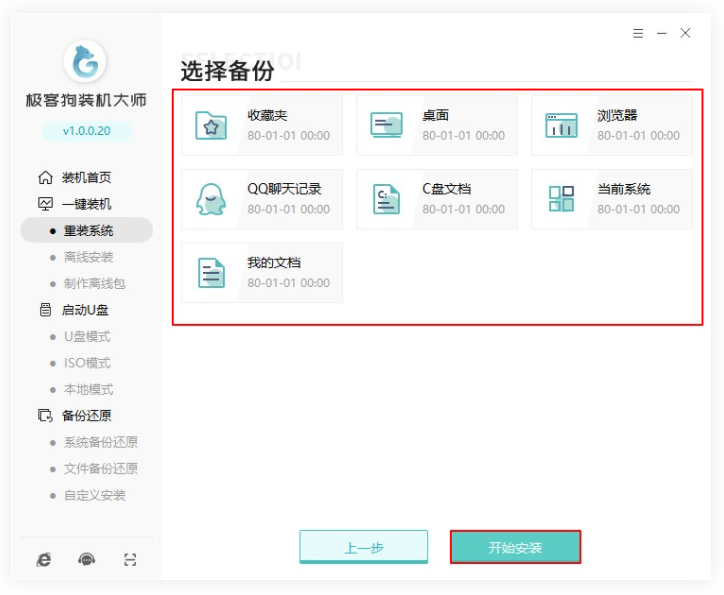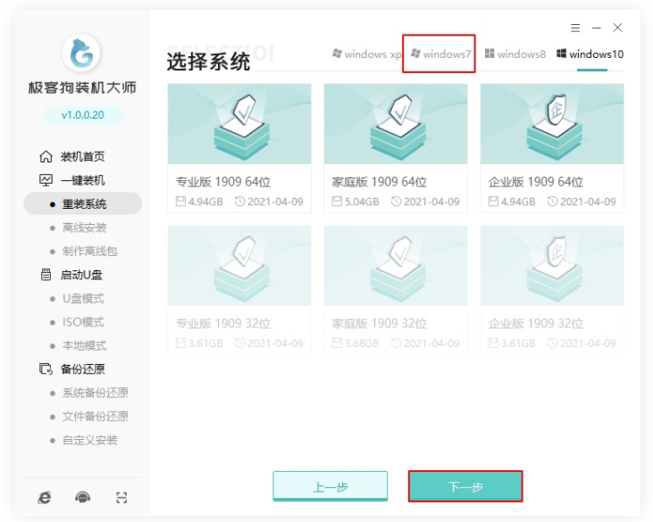1、下载并安装极客狗装机大师(原黑鲨),双击打开,进入“重装系统”页面,等待软件检测完电脑配置信息后点击“下一步”。