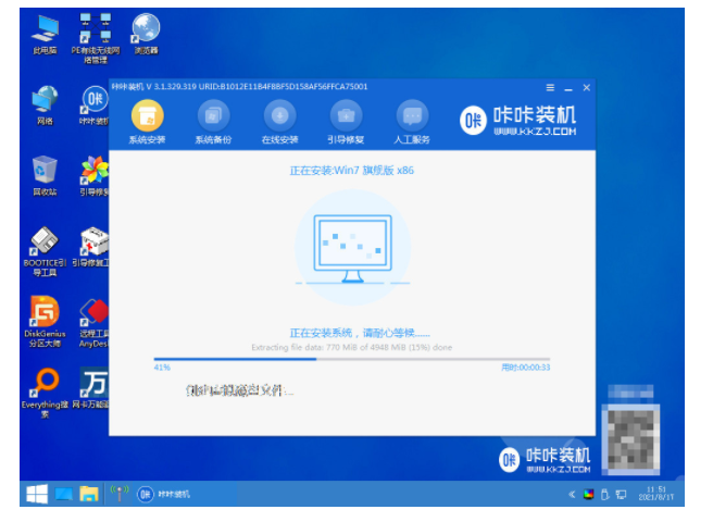 2、打开咔咔装机,选择在线重装栏目,点选需要安装的win7,点击安装此系统。