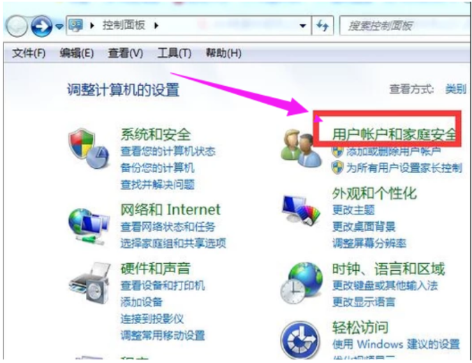 步骤二:此时在控制面板中打开用户帐户和家庭安全。