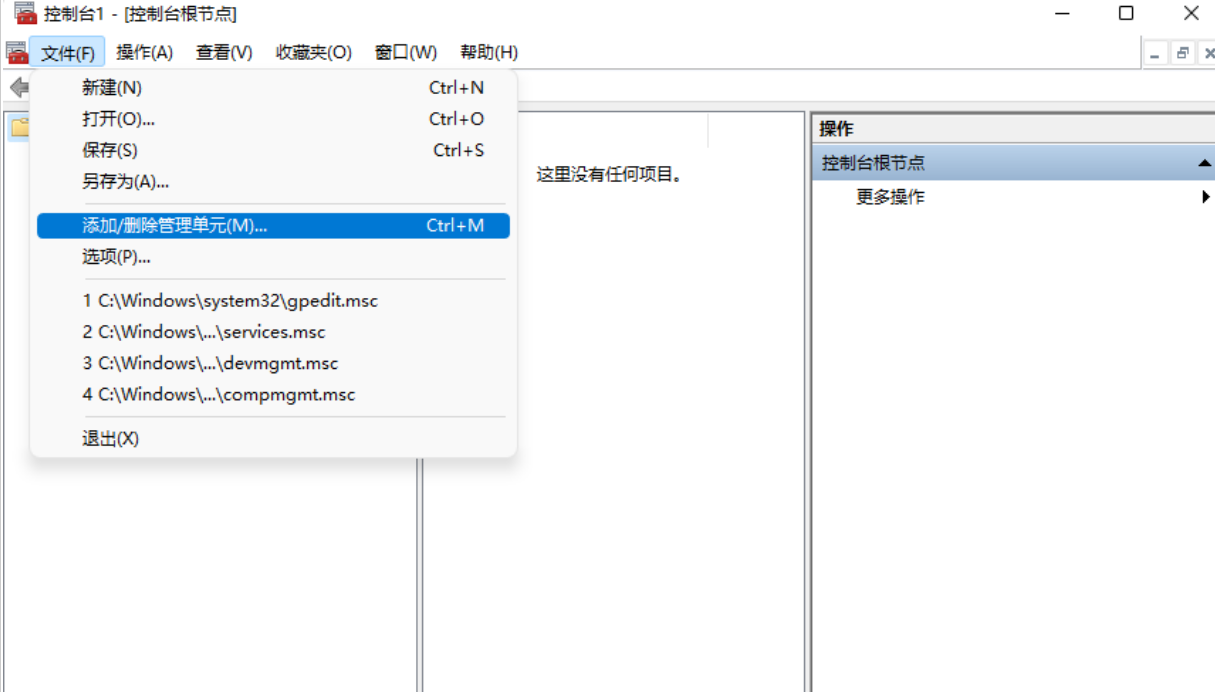 2、然后点击“文件”选项中的“添加/删除管理单元”;