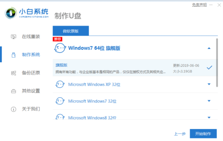2、进入系统选择页面之后,选择需要安装的win7系统,点击“开始制作”。