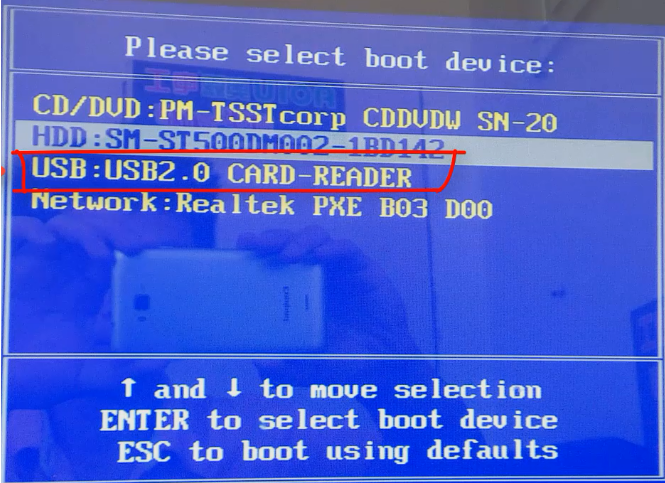 4、u盘插入需要重装的电脑usb接口,重启电脑快速断续的按启动热键进入快速启动页面,选择带USB开头的u盘启动项回车键进入。