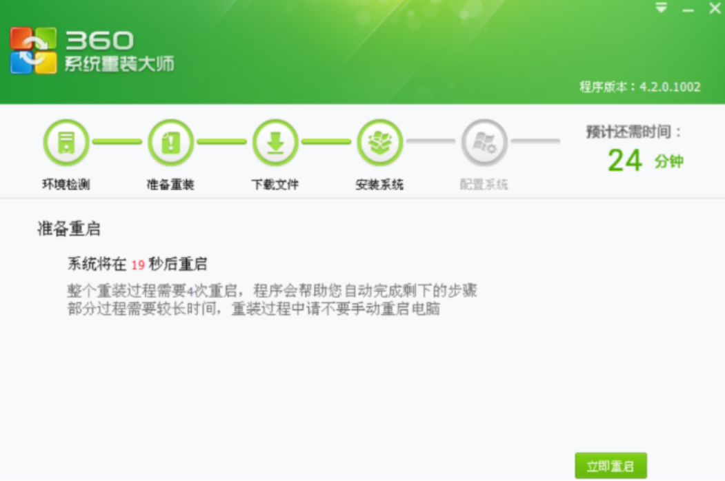 4、等待电脑系统环境下载完毕之后,立即重启电脑即可,等进入桌面之后,360重装系统win7的步骤就完成了。