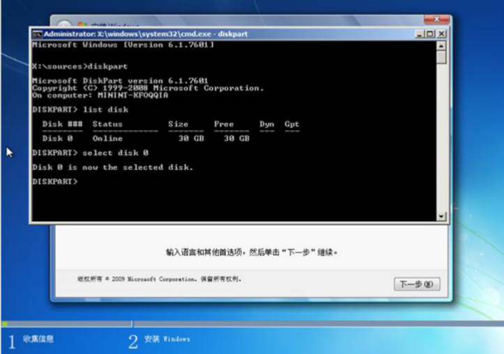 4、输入“select disk 0”命令回车,选中电脑的硬盘。