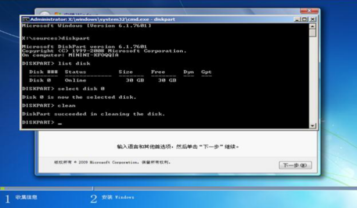 5、输入“clean”命令回车,清除硬盘中的所有分区及数据。