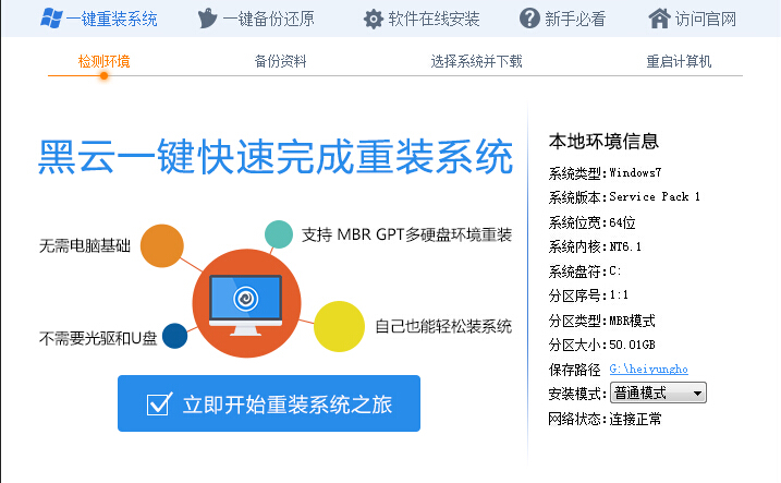 1、打开黑云一键重装系统工具,会自动检测出当前分区模式、网络状态等。