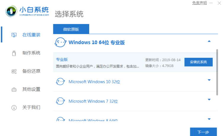 1、打开电脑安装好的小白一键重装系统软件,选择需要安装的win10位系统。(4g以上内存选择64位系统)