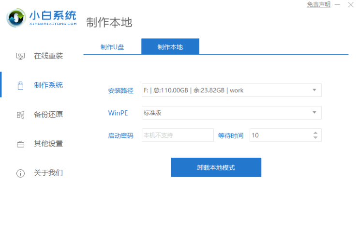 2、下载一个小白一键装机工具,打开之后选择本地模式,下载一个本地pe。将pe系统安装在C盘以外的分区。