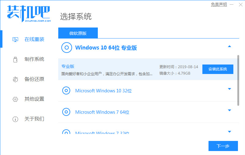 1、首先我们打开电脑浏览器搜索装机吧一键重装系统,将软件下载好并打开,然后选择要下载的系统。
