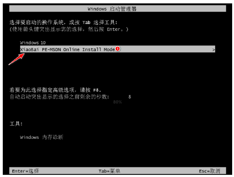 4、电脑重启后进入了启动管理选项界面,选择xiaobai-pe系统进入。