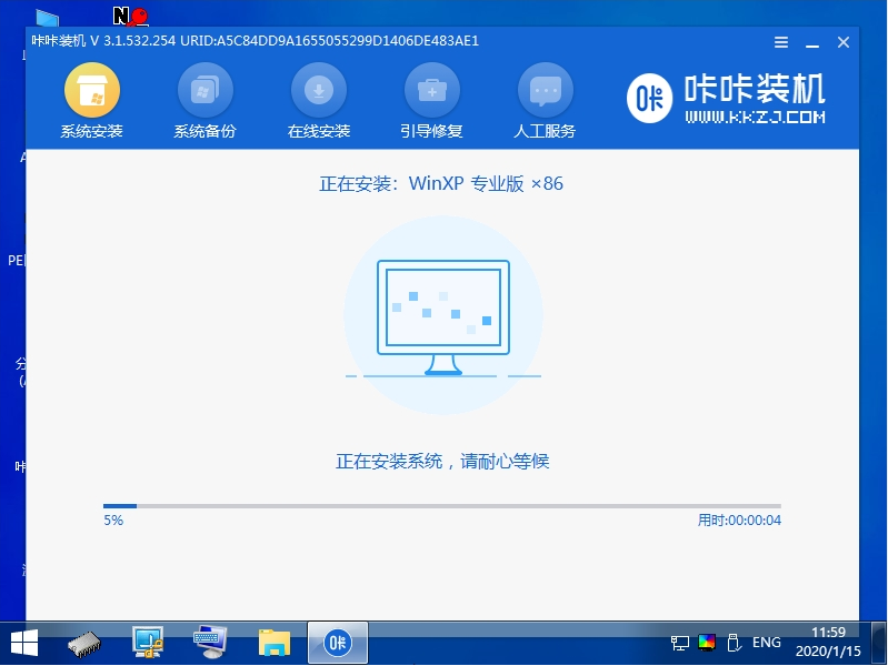 4、咔咔装机工具会自动打开并安装xp系统。