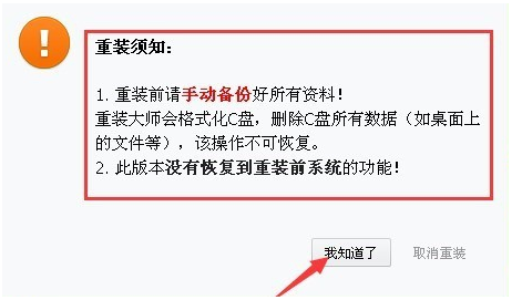 步骤四:在电脑检测完成之后,屏幕会弹出一些注意事项,看完后我们用鼠标点击我知道了。