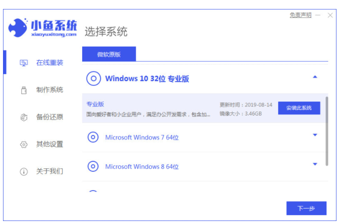 1、下载小鱼装机工具软件,选择系统进行安装。