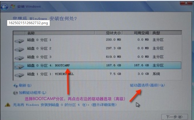7、此时选择BOOTCAMP分区,点击驱动器选项(高级),选择好BOOTCAMP分区致后点击格式化,记住千万不要点删除,别想删除之后再把Windows多分几个区。