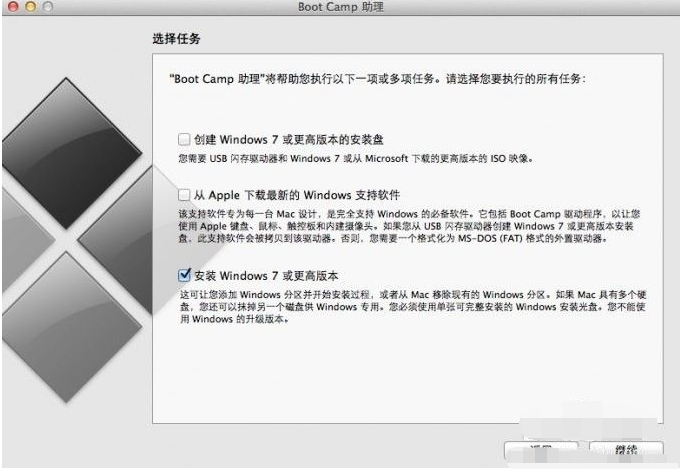 4、插入Windows 安装U盘或者光盘到电脑,再次启动Boot Camp助理,选择安装Windows 7 或者更高版本。