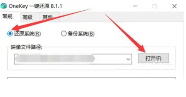 2、在“常规”版面当中,选中【还原系统】选项,单击“映像文件路径”板块下的【打开】。