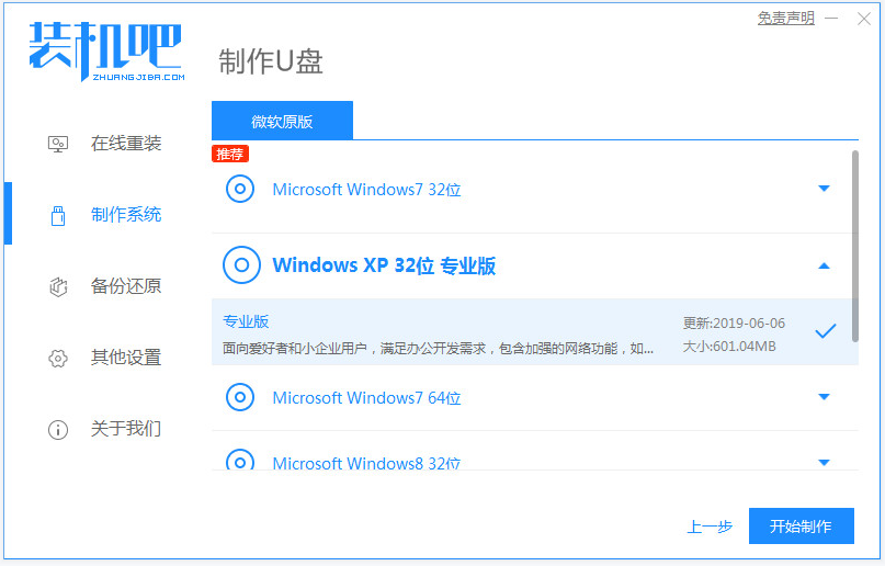 1、在电脑上安装好装机吧一键重装系统工具打开,插入空白u盘,制作系统模式下点击开始制作。