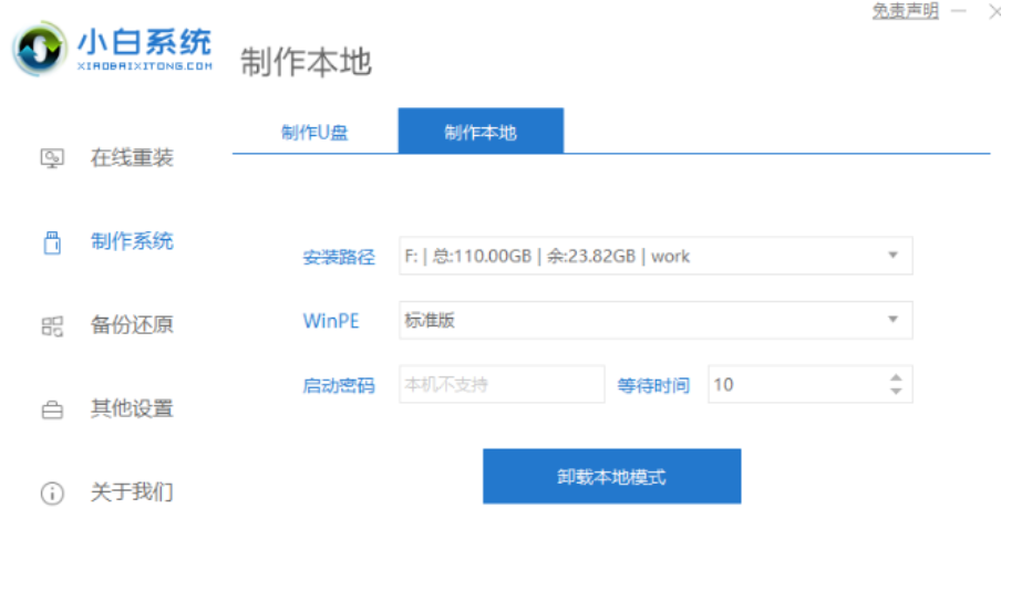 2、在桌面上打开小白一键重装系统软件,打开之后选择本地模式,下载一个本地pe。将pe系统安装在C盘以外的分区当中。