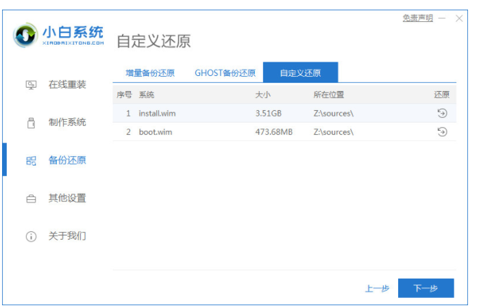 2、下载安装小白一键重装系统工具到电脑上,然后打开,选择左栏的备份还原,点击自定义还原进入下一步。