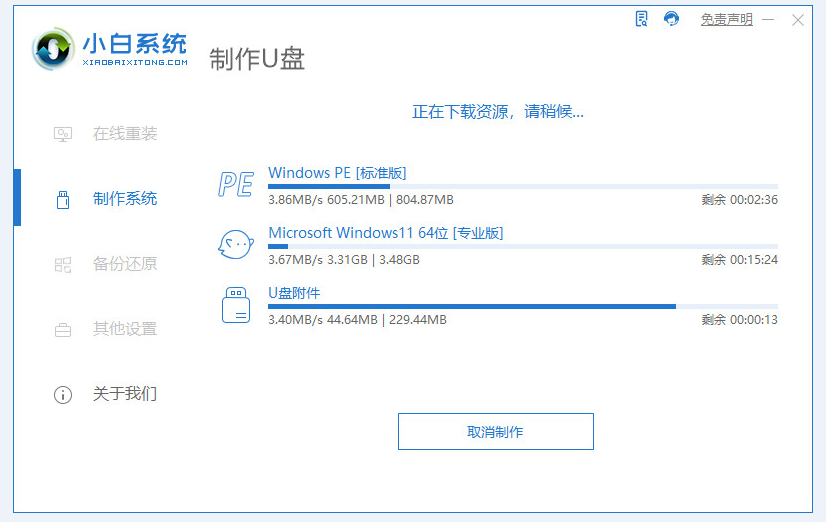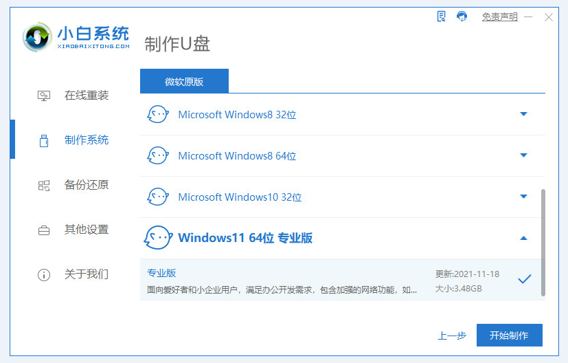 1、下载并安装小白一键重装系统软件。随后打开软件,并插入空白u盘,选择制作系统中的制作U盘,点击开始制作。