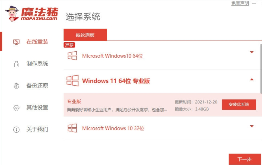 1、如何重装电脑系统win11专业版,首先下载安装魔法猪装机大师软件,选择win11系统安装。